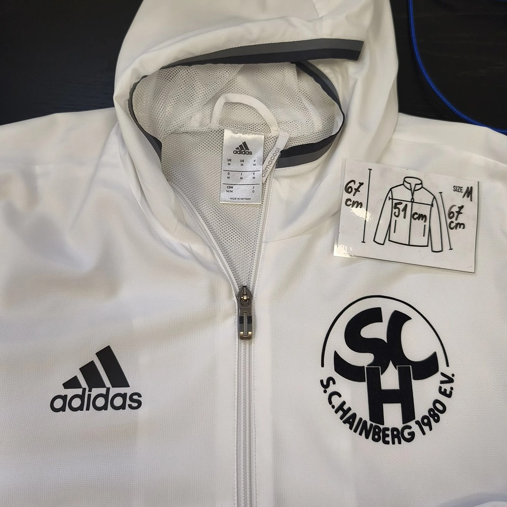 This Adidas piece is a strong option for shoppers looking for Men’s Lightweight Jackets with a sporty identity and clean retro appeal. The white base, contrast details, and printed S.C. Hainberg 1980 graphics give it a distinctive teamwear look, while the light construction makes it suitable for everyday wear, training layers, and casual street styling.