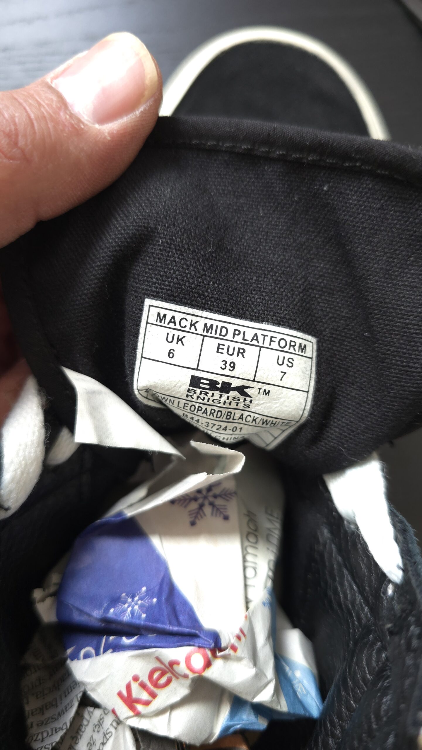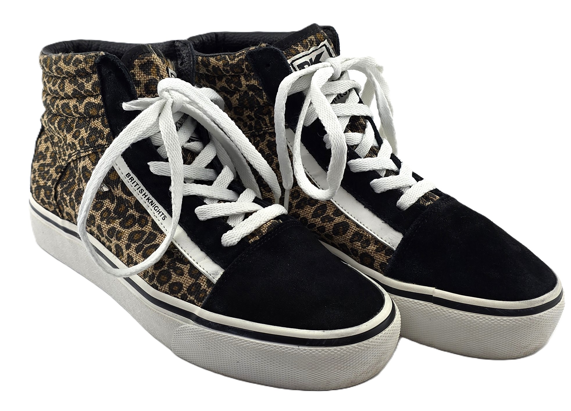 Marked as the “MACK MID PLATFORM” style on the size label, this pair is built for everyday wear with a supportive ankle height and a stable-looking platform base. If you browse a second hand store for unique high-tops, this design hits the sweet spot: recognizable British Knights branding, a fashion-forward animal pattern, and a classic sneaker layout that pairs well with modern basics.