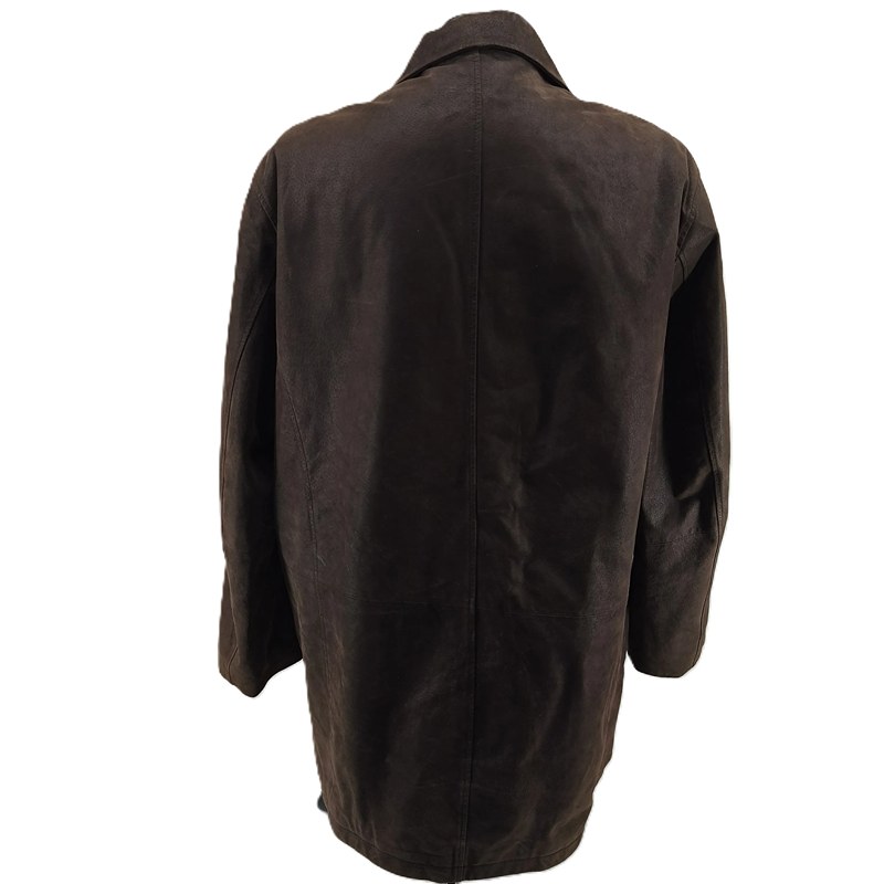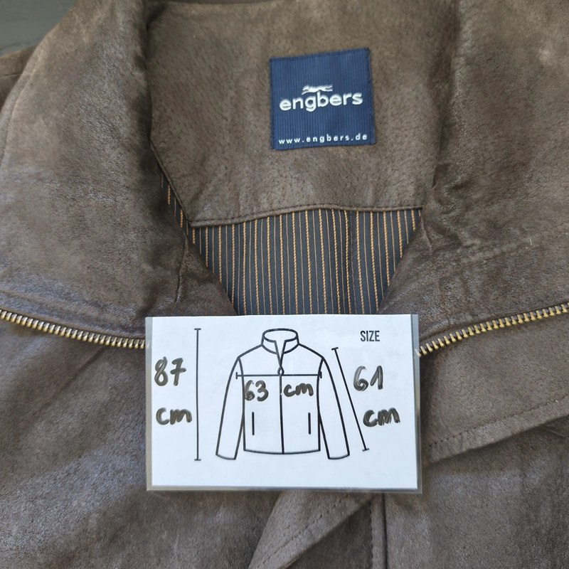 Classic Engbers vintage leather coat in dark brown suede, size L. Soft-touch genuine leather with inner lining and button-zip closure. Measurements: length 87 cm, chest 63 cm, sleeve 61 cm. Cleaned, refreshed, and ready to wear. Perfect for cool autumn and winter days.
