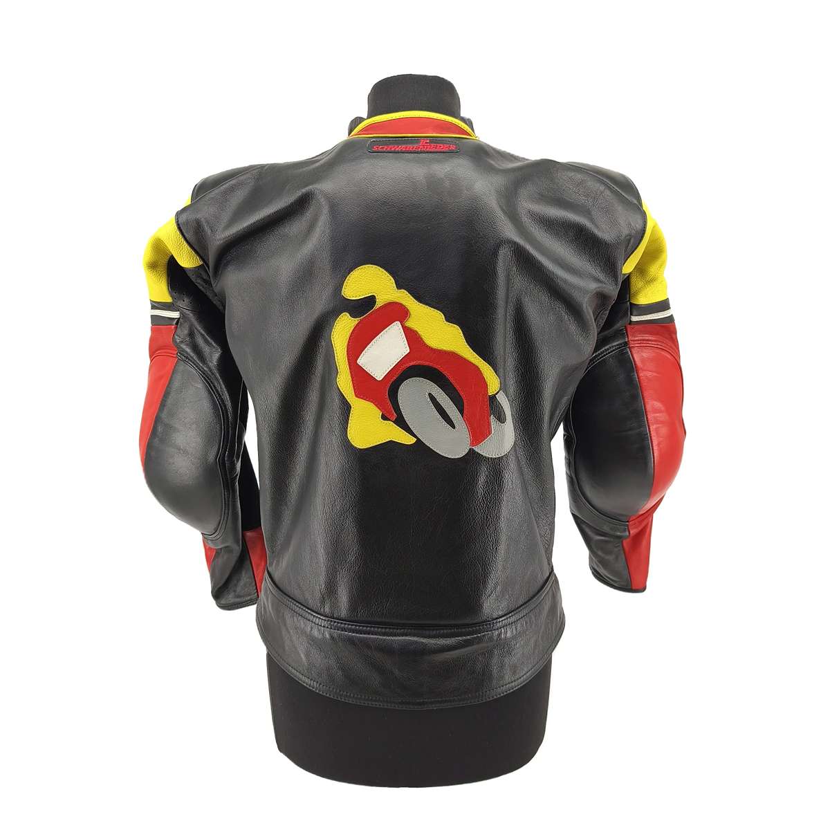 Motorcycle-inspired leather jackets remain a strong element of vintage fashion. This Schwabenleder jacket easily transitions from riding gear to everyday streetwear. Its bold colour accents make it a standout garment that pairs well with neutral wardrobe pieces.