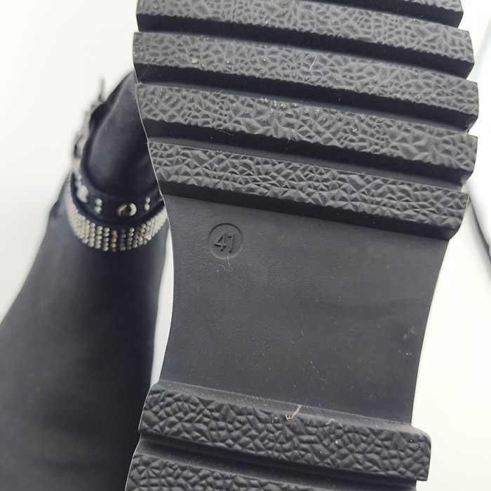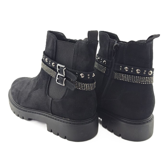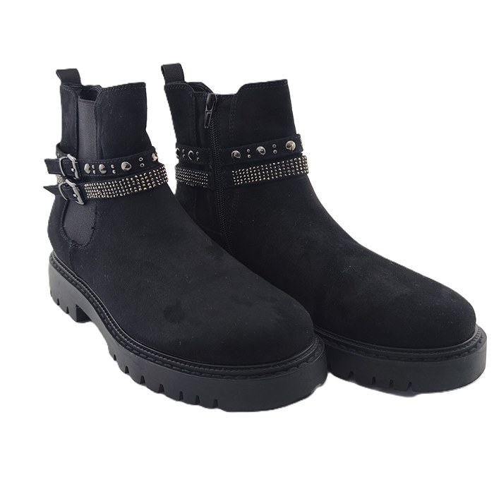Vintage Boots Graceland are where rebellious energy meets classic vintage fashion. Crafted from soft black faux suede, these vintage boots ladies feature double metallic buckles and subtle studs that reflect light with every step. Their chunky sole ensures comfort and stability, while the refined finish gives them a confident, urban edge.