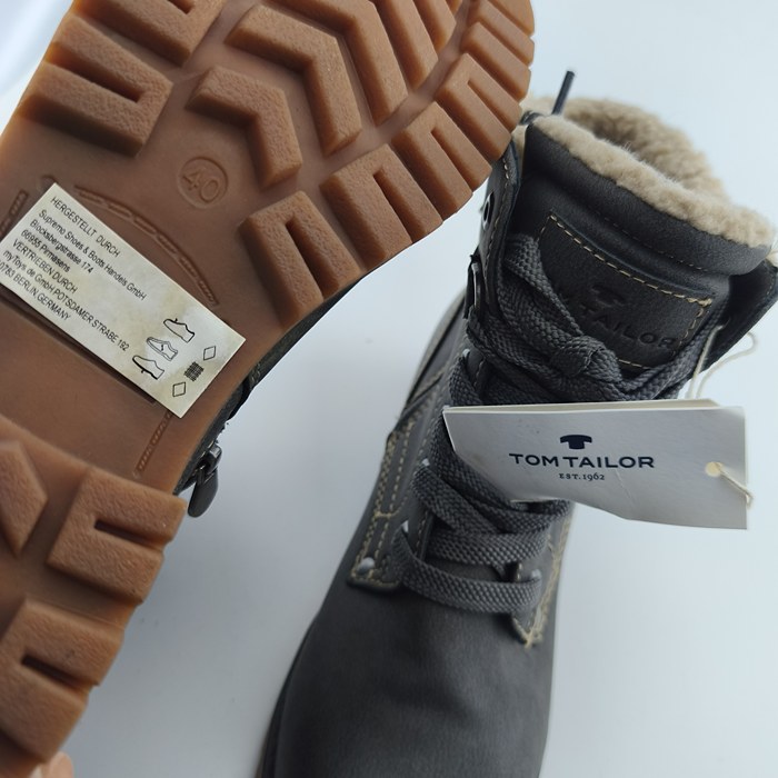 Stay warm in style with Vintage Boots Tom Tailor. Made from durable TEX material, these dark grey ankle boots feature a cozy faux-shearling lining and sturdy traction soles. Perfect for modern women who appreciate vintage fashion and lasting comfort.