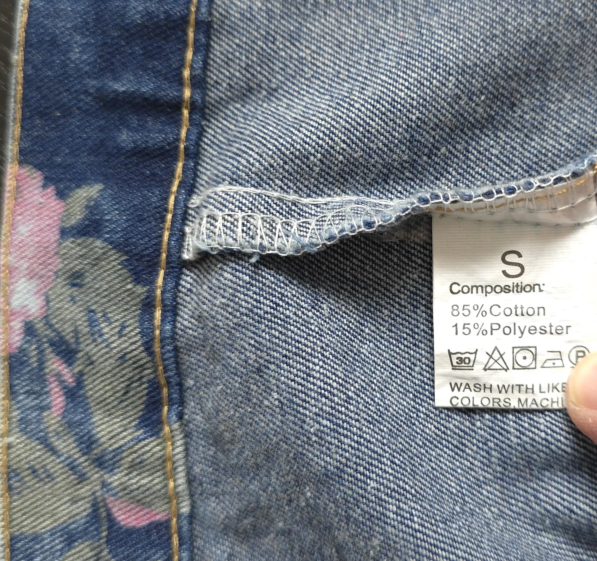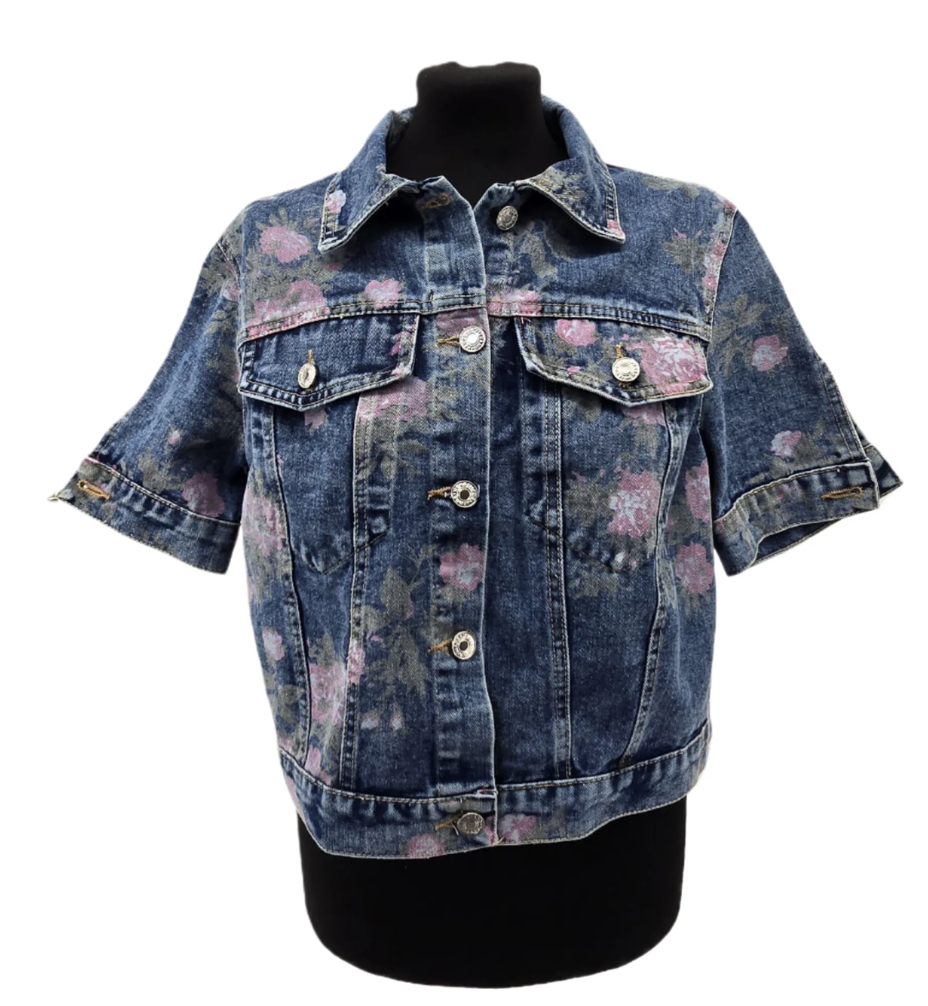 Retro denim jacket for women in size S with delicate floral print. Made from 85% cotton, 15% polyester. Short sleeves, classic collar, front pockets. A perfect vintage choice for modern outfits – fresh, unique, and full of character.