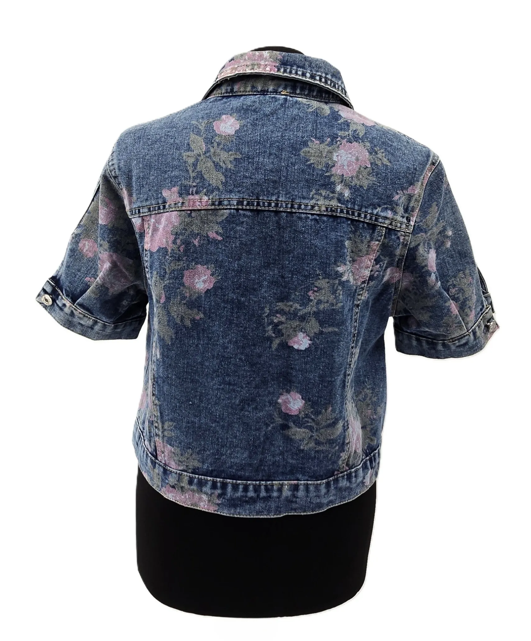 This short-sleeve floral denim jacket is a standout piece among vintage jackets for women. With its elegant rose print on classic blue denim, it captures the essence of retro outerwear in a fresh, wearable design.