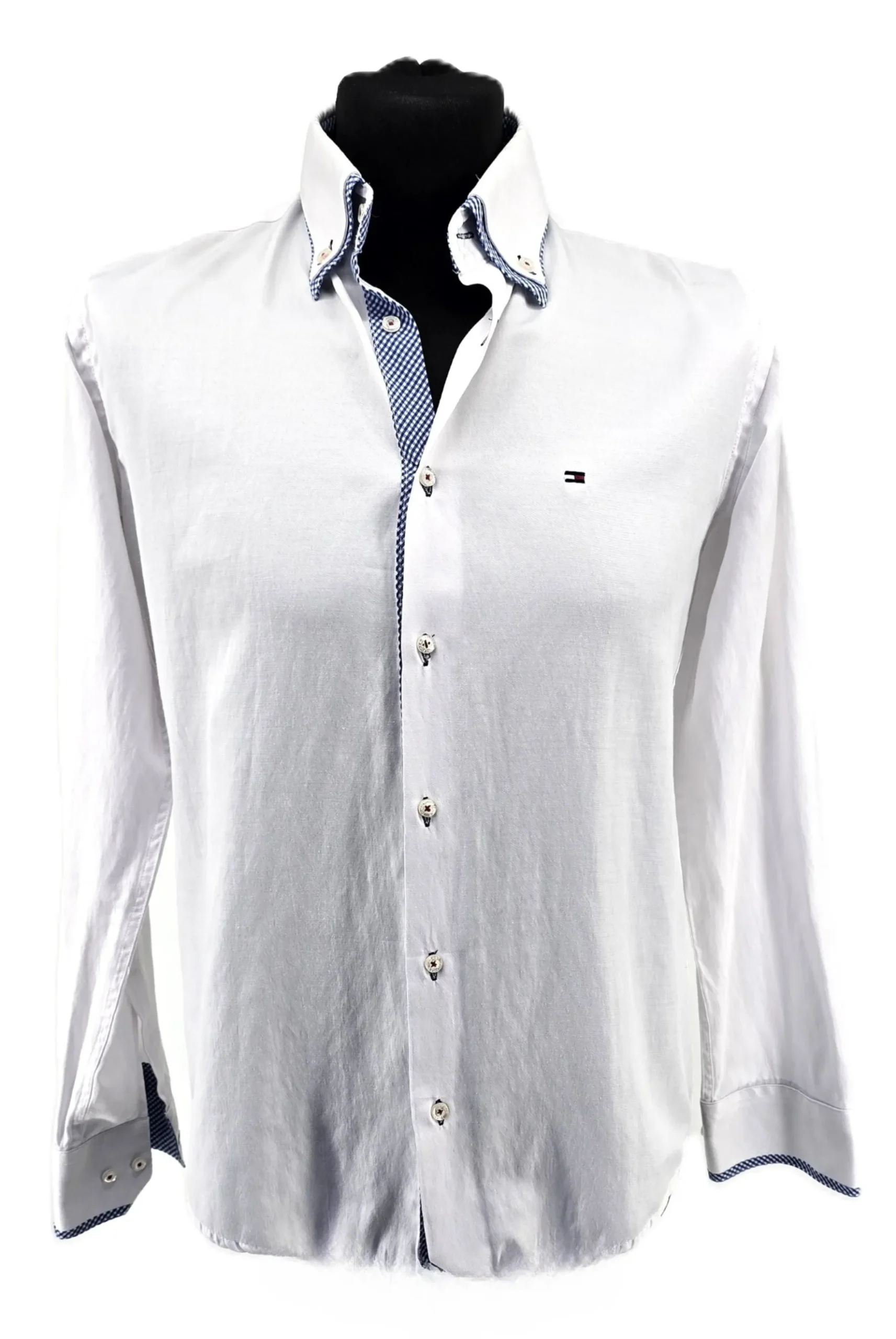 The vintage men’s shirt Tommy Hilfiger embodies the timeless American spirit. Crafted from high-quality cotton, it features a sleek slim-fit silhouette and refined design details such as a check-pattern collar and button placket in blue and white gingham. The soft texture and breathable fabric make it ideal for both business and leisure.