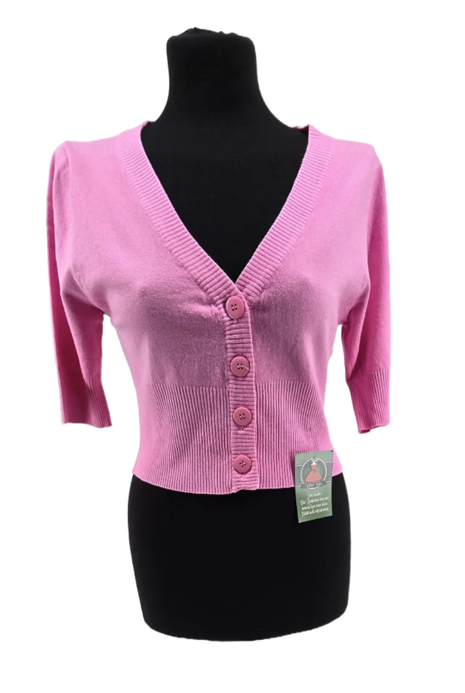 Sweet bubble-gum pink, buttery-soft touch and a flattering cropped cut. This vintage cardigan features 3/4 sleeves, deep V-neck and chunky buttons—easy to style with tees or dresses, it adds playful color and comfort to your daily wardrobe. Refresh your look with a cheerful classic.