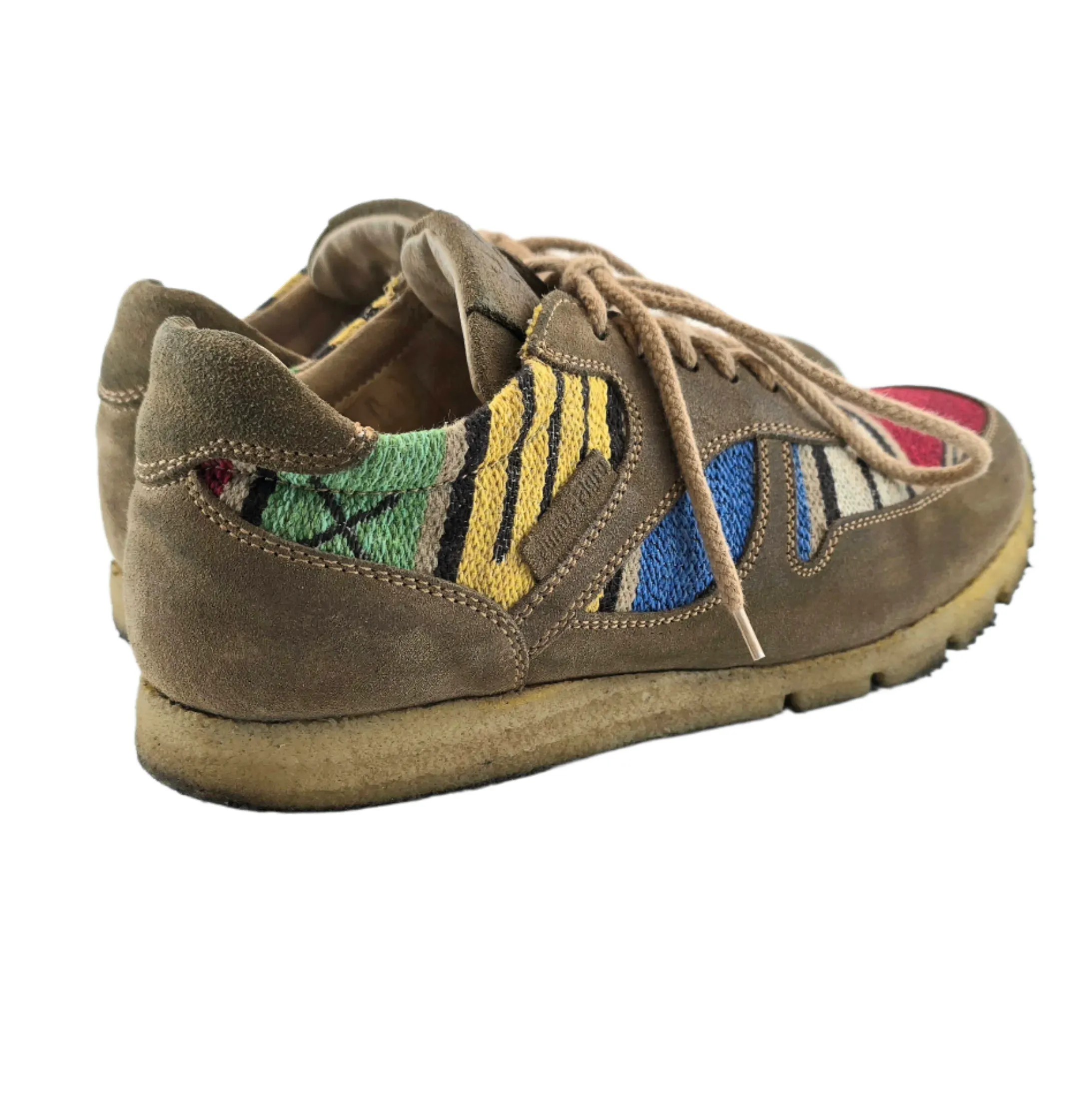 These sneakers feature a high-quality suede upper, giving them a soft yet durable structure. The woven textile panels add a vibrant touch with multicolored geometric patterns, evoking the bold artistic expressions of the 1970s retro style. The rubber sole ensures durability and comfort, making them perfect for everyday wear. Looking for other retro footwear options? Check out our Vintage Shoes Collection for a curated selection of classic designs.