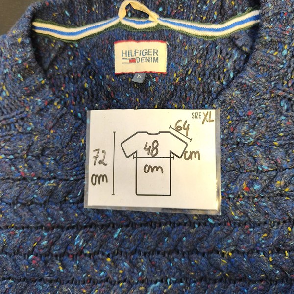 Fit can vary by brand and era, so the best reference is the measurements provided (chest 48 cm laid flat, length 72 cm, sleeve 64 cm). This helps you compare with a sweater you already own for an accurate match.