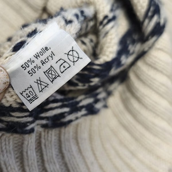 It’s designed as a warm winter knit. The wool blend provides cosy insulation, while the acrylic helps with durability and everyday practicality—great for shoppers looking for vintage sweaters uk suited to cold-weather wear.