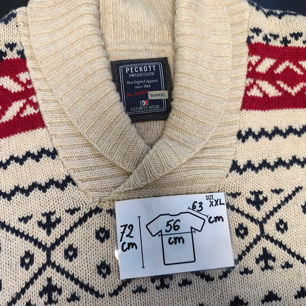 This vintage Peckott sweater brings classic cold-weather character: a cream base with a traditional Nordic-inspired pattern in contrasting tones, finished with a chunky shawl collar that frames the neckline beautifully. It has that timeless “winter cabin” vibe, yet it still works in the city—exactly the kind of statement piece people want when searching for Vintage Sweaters for Men that look authentic and feel cosy.