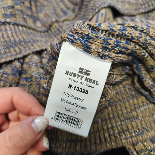 - Colour: Brown (dominant) with blue multicolour knit