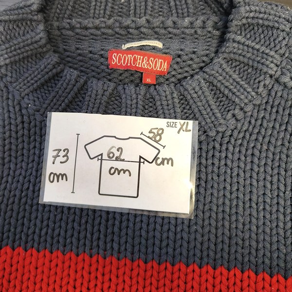 Vintage men’s sweater by Scotch & Soda in blue, size XL. Chunky knit with a red and cream stripe and oversized fit. Fast EU shipping.