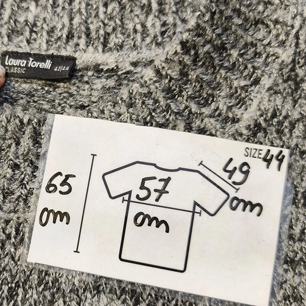 - Measurements (flat): length 65 cm; chest (pit to pit) 57 cm; sleeve 49 cm