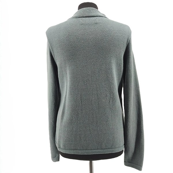 The design is defined by a refined mock neck collar and a traditional knit texture that adds structure without visual heaviness. The grey-green colour gives the sweater a muted, natural tone that fits easily into a minimalist wardrobe and pairs well with neutral and earthy shades commonly found in vintage womens knitwear collections.
