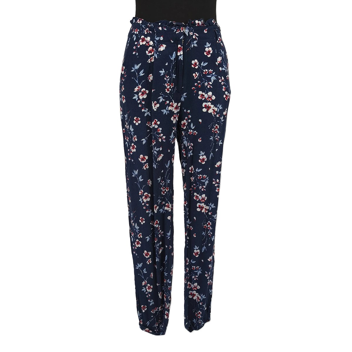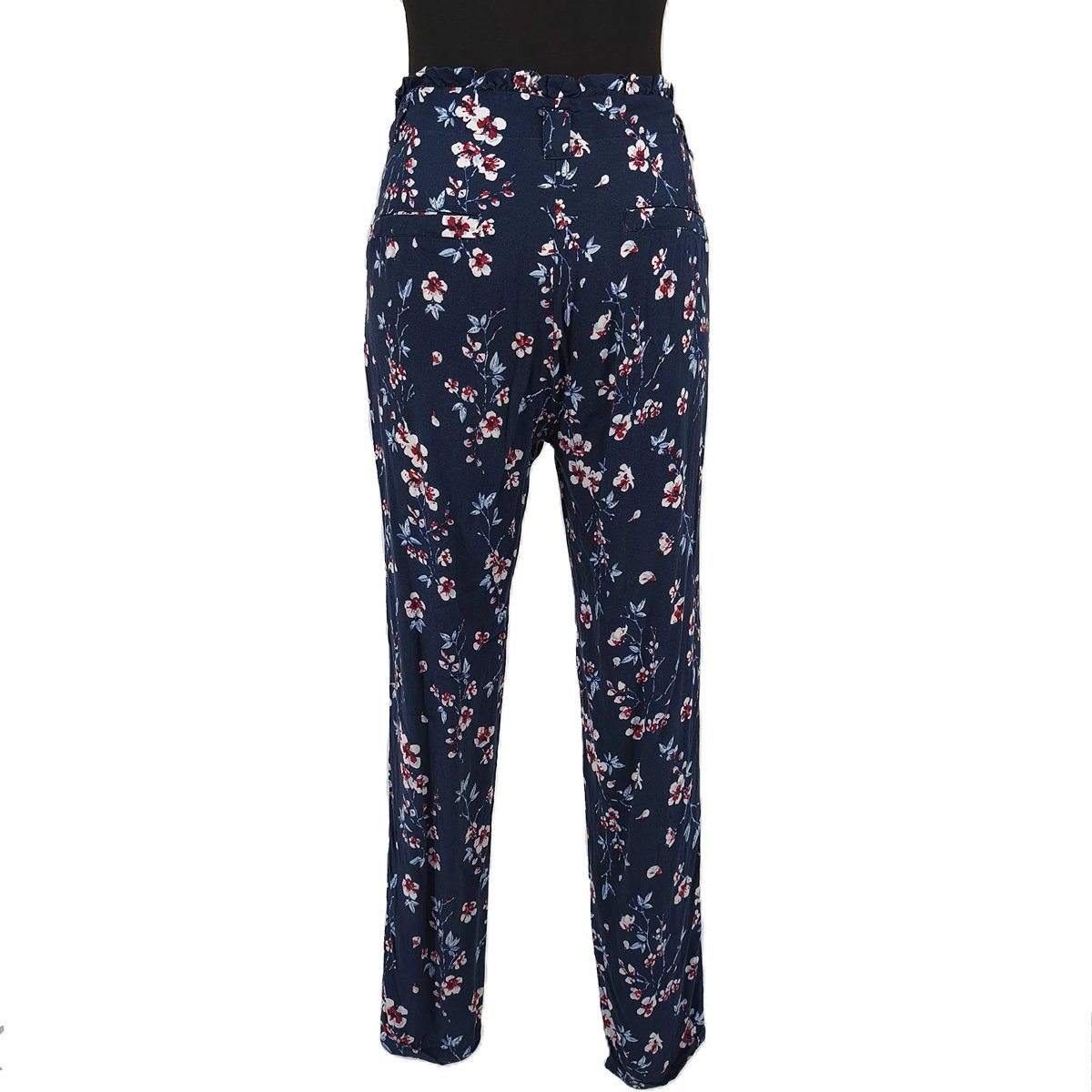 Lightweight navy floral trousers with a soft, fluid touch and a paperbag waist. The self-tie belt shapes your silhouette, while straight legs move freely. Perfect vintage ladies trousers for warm days—style with a white tee and sandals for instant ease.
