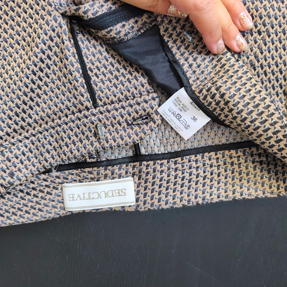 Vintage trousers Seductive capture the essence of timeless sophistication. Their soft-touch woven fabric and subtle geometric pattern evoke the spirit of 70’s and 80’s elegance, while offering a modern fit that flatters the silhouette. The warm beige and navy tones create a chic retro mood — perfect for any stylish woman.